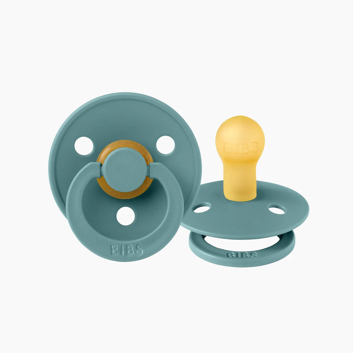 The BIBS Colour pacifier is the original BIBS pacifier and has been on the market for over 40 years. The cherry shape (round) nipple resembles the shape and size of the mother’s soft nipple and promotes a similar tongue placement and sucking technique as when breastfeeding since the round shape allows the sides of the tongue to elevate and cup around the nipple.